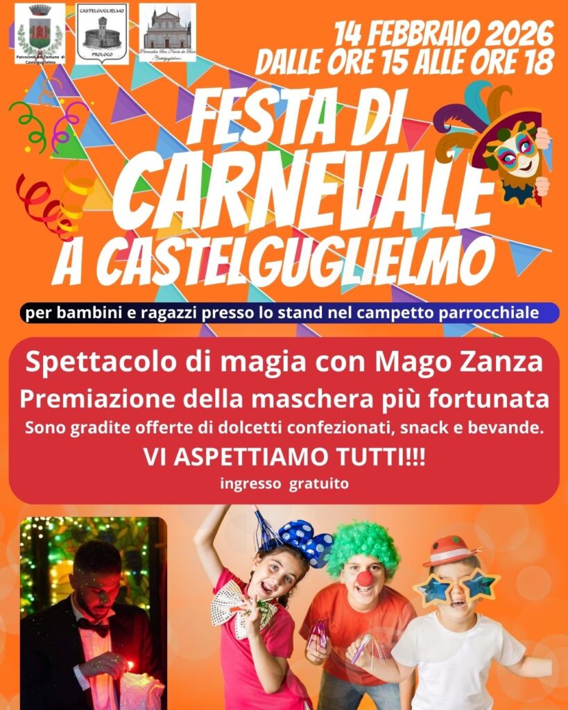 Castelguglielmo si prepara a festeggiare il Carnevale con un pomeriggio all’insegna dell’allegria e dello spettacolo. L’appuntamento è per sabato 14 febbraio 2026, dalle ore 15 alle ore 18, presso lo stand nel campetto parrocchiale.