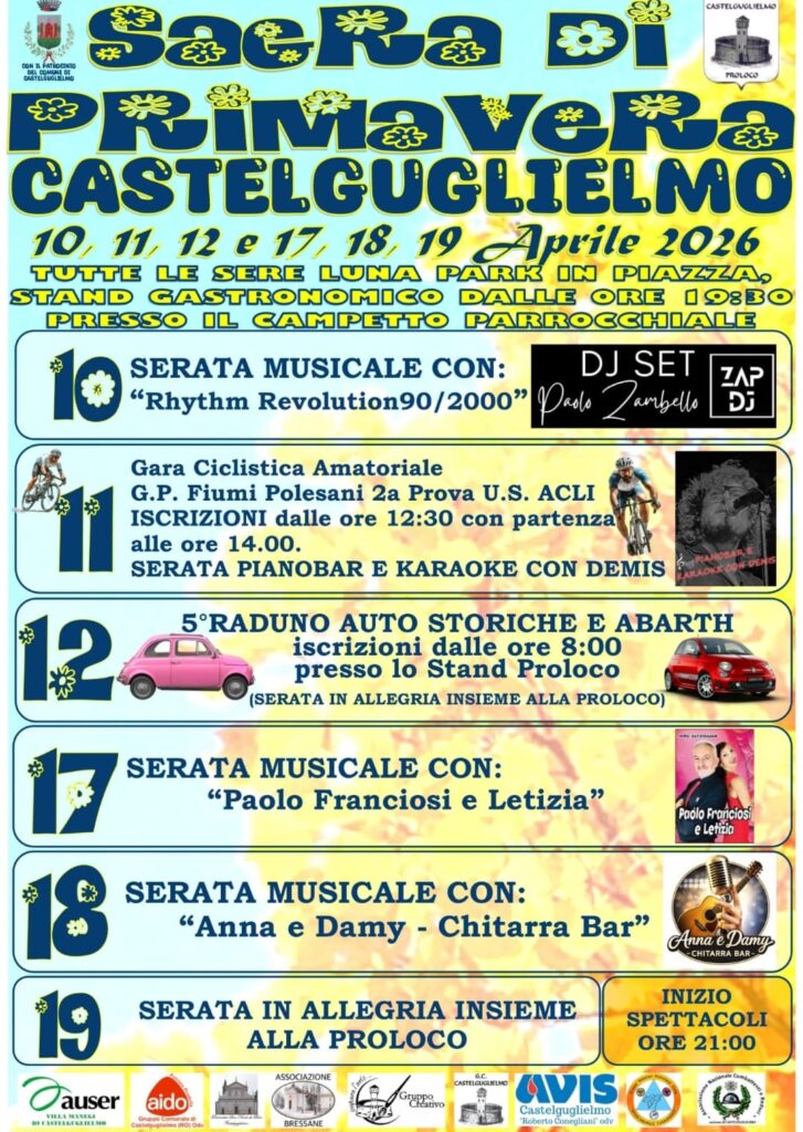 Vi invitiamo alla Sagra di Primavera 2026 in programma a Castelguglielmo nei giorni: 10, 11, 12 e 17, 18, 19 aprile 2026. Sei serate con musica, sport, motori e momenti di convivialità.